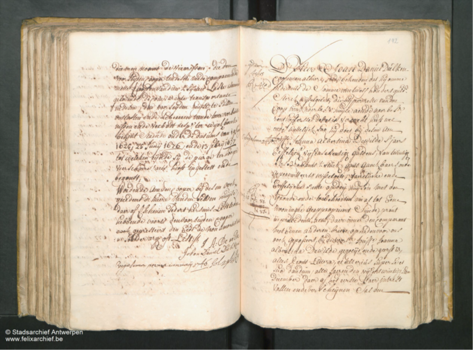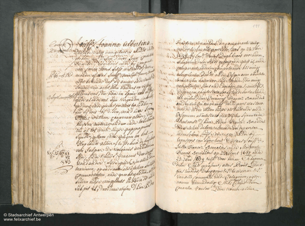 Dewilde eenige naergelaeten kiidt ende dochter van wijlen D’heer Joan Cornelis De Wilde, ongehout ende by comperitie van Jaeren haers selfs wesende, daer moeder af was Jouffe Maria Catha[rina] Francese Bernaldes ende bekende dat sij omme ende mitsdi somme van acht tien hondert en vijftig guldens eens, die haar in specie van wissel gelde al ende wel sijn vergouden, vercocht gecedeert, ende getransporteert te hebben soo sij doet bij desen, aen d’heer Joan Daniel Dülken Coopman alhier, drij huijsen mettengronden ende toebehoornden nu al tot eenen huijse geapproprieert sijnde, gestaen ende gelegen in het Hop landt alhier, tusschen de huisinge van Jaspar De Verginis aen d’enen sijde, ende thuijs genaemt den Arent aen d’ander sijde, gelijck & in allen der manieren, op ende met alsulcken servituden Commoditeyten, ende gerechtigheden als de selven huijse eenigsents hebbende subject is, daer inne wijlen d’ heer Pedro // Franceze Bernaldes der Comparante entg moederlijcken over groot vader was op 23: 7ber 1648 bij sonr Danel Deeghbroot voor heeren schepenen deser stadt gegoeijt ende geërft is, aende Comparante in desen competerende als eenige naergelaeten kindt ende Erfgenaem abintestato vanwijlen haere voorseijde moeder, die eenige naegelaeten kint ende dochter was, mitsgrs: Erfgenaem ab intestato, soo sij ten desen verclaerde van wylen d’heer Emanuel Francez Bernaldes een den welcken een gerecht derde paert was toecomende in den selven huijse als kindt ende mede Erfgenaem ab intestato van wijlen sijnen vader den voorsz d’ heer Pedro Francez Bernaldes den welcken de twee resterende derdepaerten in denselven huijse vercegen hadde bij transport van sijne twee susters Jouffren Suster Francez Bernaldes, en de Margareta Frances Bernaldes op 23 Meert 1677 ende 25: 7ber 1679 resp:s voor heeren Schepenen desen Stadt gepasseert, alles Prout Littere quas tradidit …